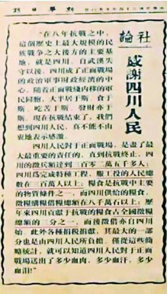 抗战胜利后的1945年10月,《新华日报》发表社论《感谢四川人民》,“四川人民对于正面战场,是尽了最大最重要的责任的”。