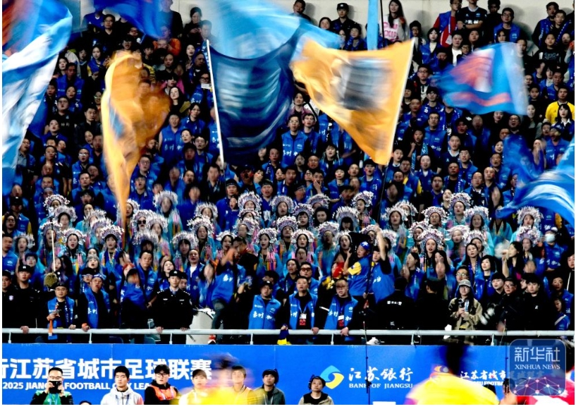 11月1日,在南京奥体中心举行的“苏超”决赛上,泰州队球迷为球队加油助威。新华社发(曹政 摄)