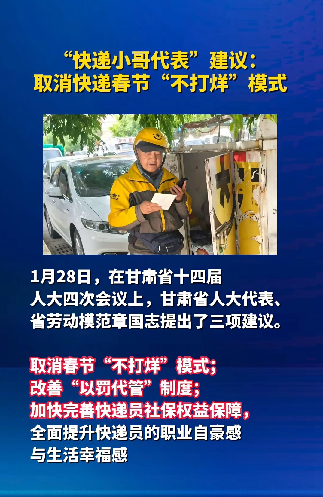 作为一名从业13年的快递员,章国志的建议代表了不少基层快递员的心声:几乎全年无休的工作能在春节停一停,渴望自己能歇一歇,与家人团聚。长期以来,春节值守被赋予了过多奉献光环,却在一定程度上遮蔽了部分从业者“被自愿”的困境。这次章国志的建议将快递员的劳动权益保护置于公众讨论的聚光灯下。这一呼吁与国家政策的导向正相契合。