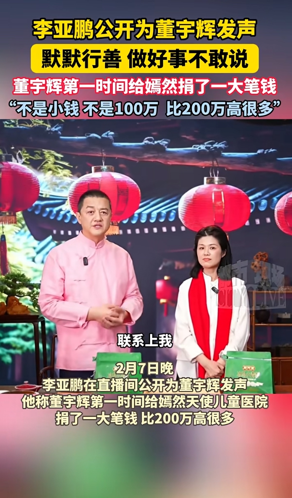 由于低调行善,未对外公开捐款事宜,董宇辉被贴上“伪善”“铁公鸡”标签。面对饱受争议的董宇辉,李亚鹏豪言力挺,“令狐冲不敢蹚浑水,怎么行走江湖?”董宇辉则隔空回应“李老师侠之大者,令人钦佩”。两人都呼吁大家多关注嫣然、多关注公益。