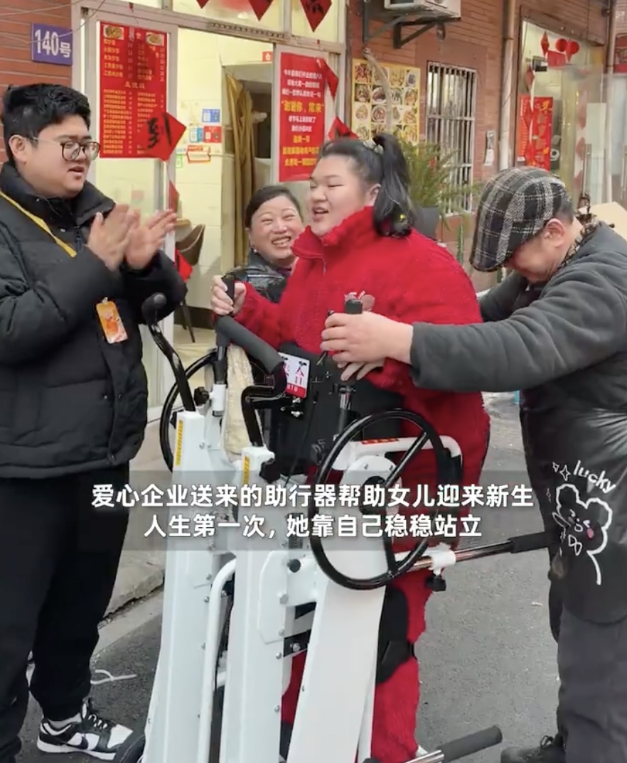 临行前,夫妻俩特意摆下团年饭答谢多年帮衬的老顾客。与此同时,爱心企业捐赠助行器,在器械的辅助下,女儿第一次靠自己站了起来。