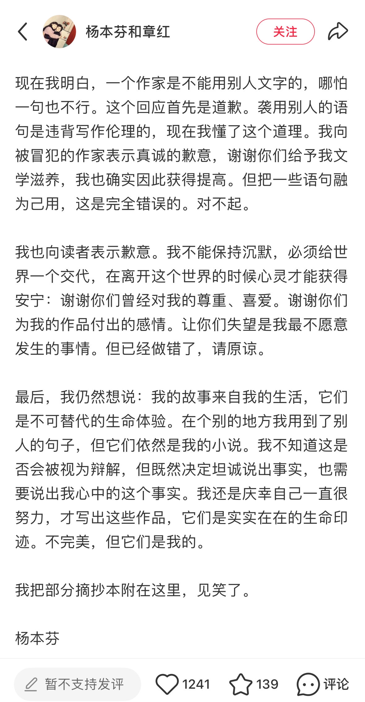 杨本芬的坦诚赢得了不少网友的共情和理解,但这一事件也引发了大众对文字创作技艺与伦理的深层次讨论,尤其是在AI时代下,文字创作者该如何用好人工智能工具,做好借鉴与创新的辩证统一等话题也成为大家讨论的热点。
