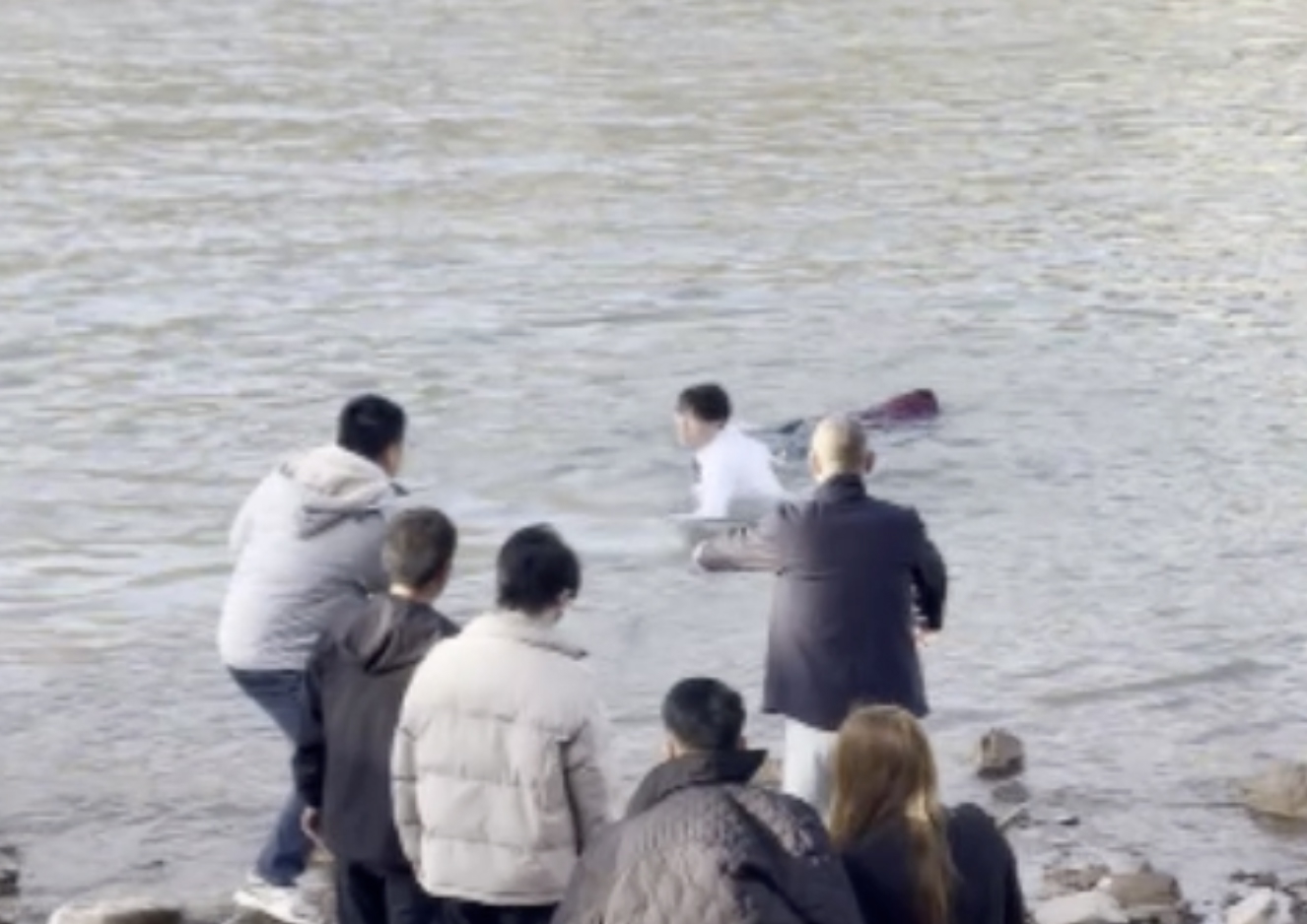 视频中,一名戴着眼镜、穿着白色衬衣的男子,在水中奋力将一名女子往岸上拖,到达岸边时,几名群众接力救助,合力将女子救起。