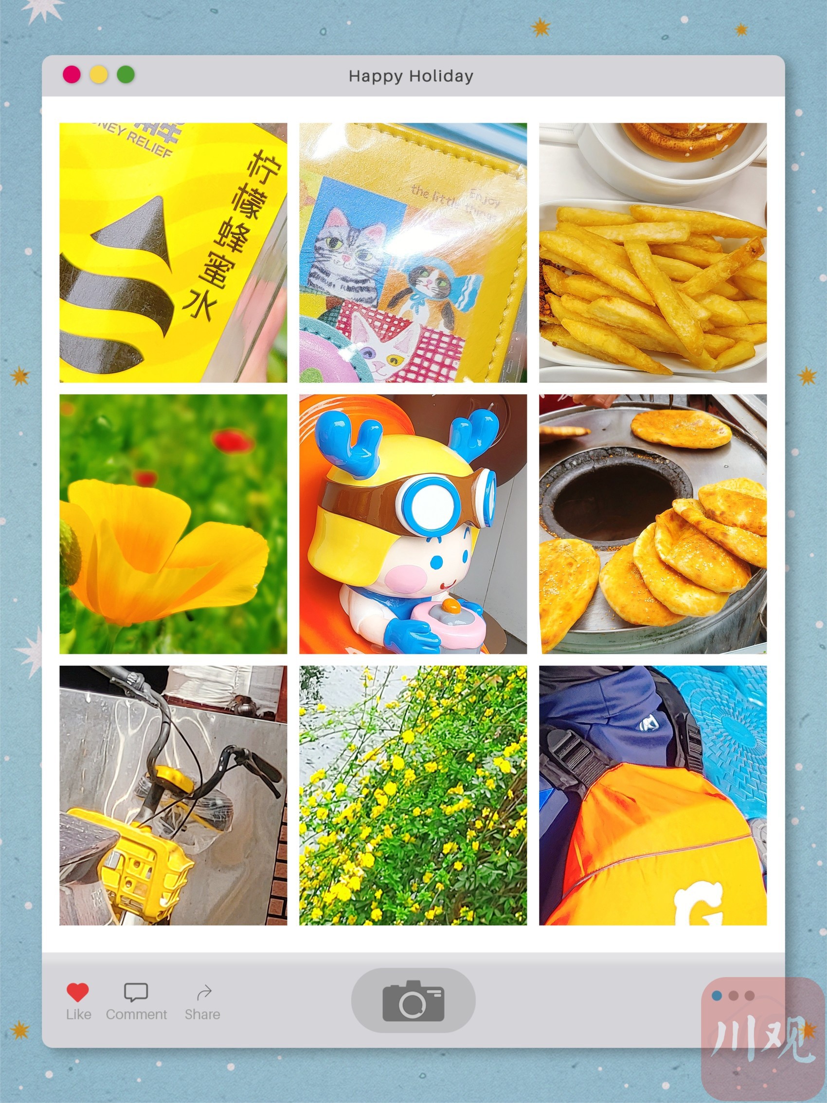 “Color Walk”的玩法很简单,出门前先选定一种自己喜欢的颜色,然后出门散步,寻找并拍摄同色系的事物——街头的建筑、来往的车辆、路边的花草、路人身上的衣物……就这样化身“色彩猎人”,一路 “寻宝”,随手拍就能收获一组色调和谐的“九宫格”美图,情绪价值拉满。